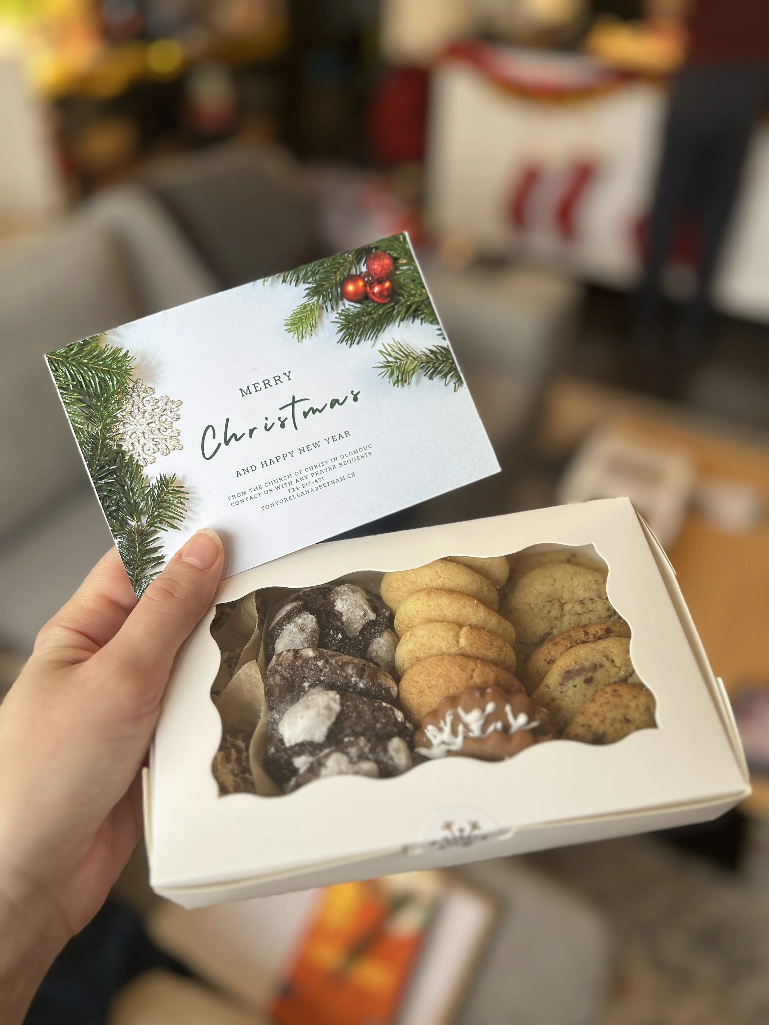 To get in all the Christmas cookie fun, we baked some typical American cookies (chocolate chip, snickerdoodle, double chocolate, gingerbread, rice crispy treats) and shared them with our friends and community. Since most people are getting plenty of Czech cookies from friends and family, we figured we should give them cookies they might not get as often and share in each other's culture. We baked nearly 20 boxes of cookies and gave them to our friends, the local pharmacy, and hospital.